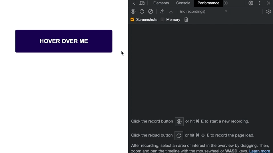 After these modifications, we see a significant improvement in performance - no Layout actions at all! This is because the browser was able to segregate this element into another layer, render it early, and during hover, simply arranges the layers in the right order during composition. This eliminated the costly Layout actions.